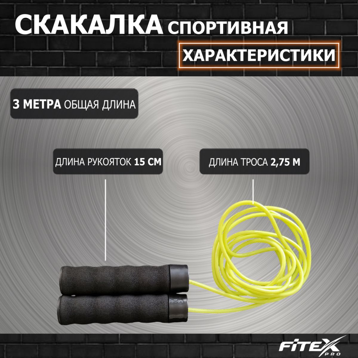 Скакалка FORTIUS ПВХ длина 3 м, черный/желтый