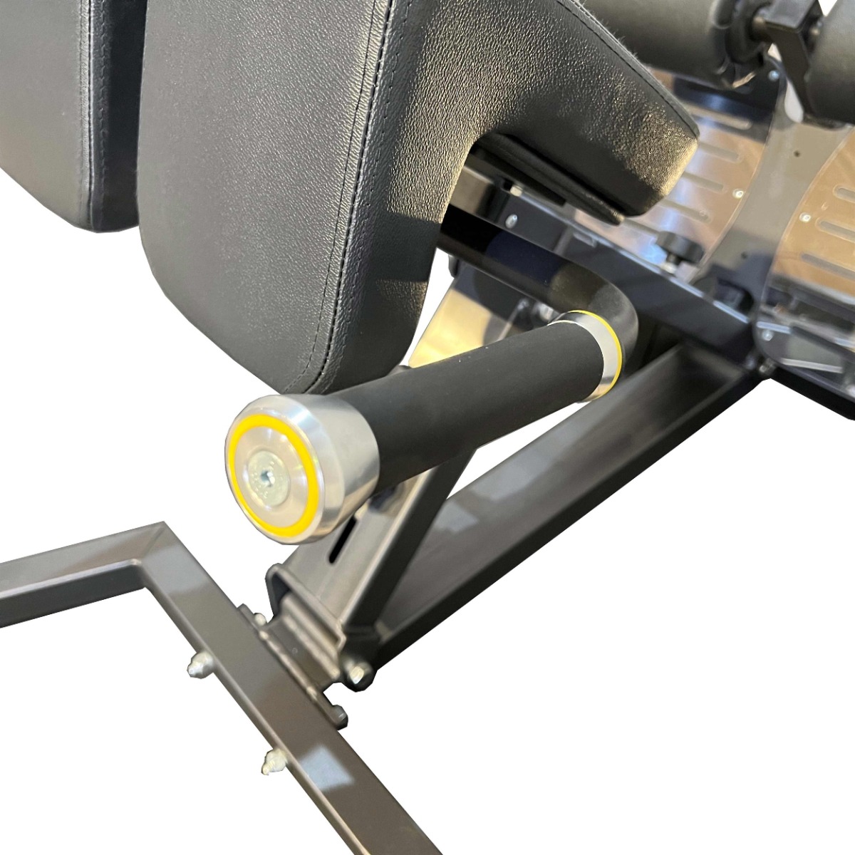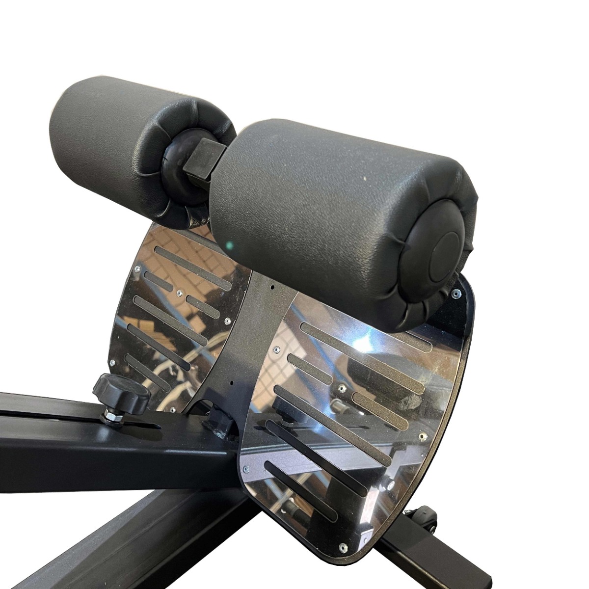 Подушка для фиксации корпуса и валики для упора ног выполнены из вспененного полиуретана, обеспечивающего оптимальную плотность и комфорт при тренировке. Обивка из износостойкой искусственной кожи чёрного цвета с гладкой фактурой. Возможен выбор цвета под заказ.