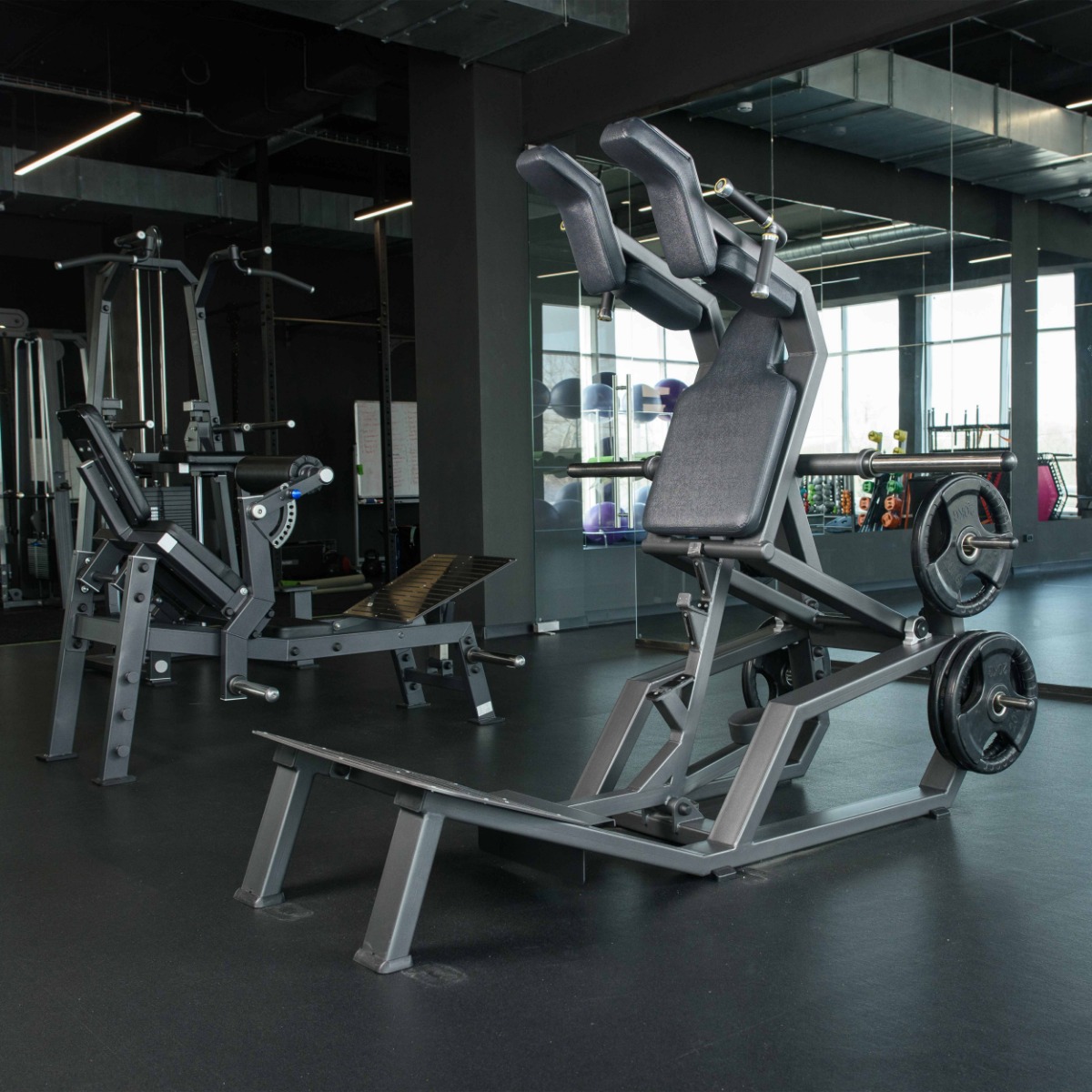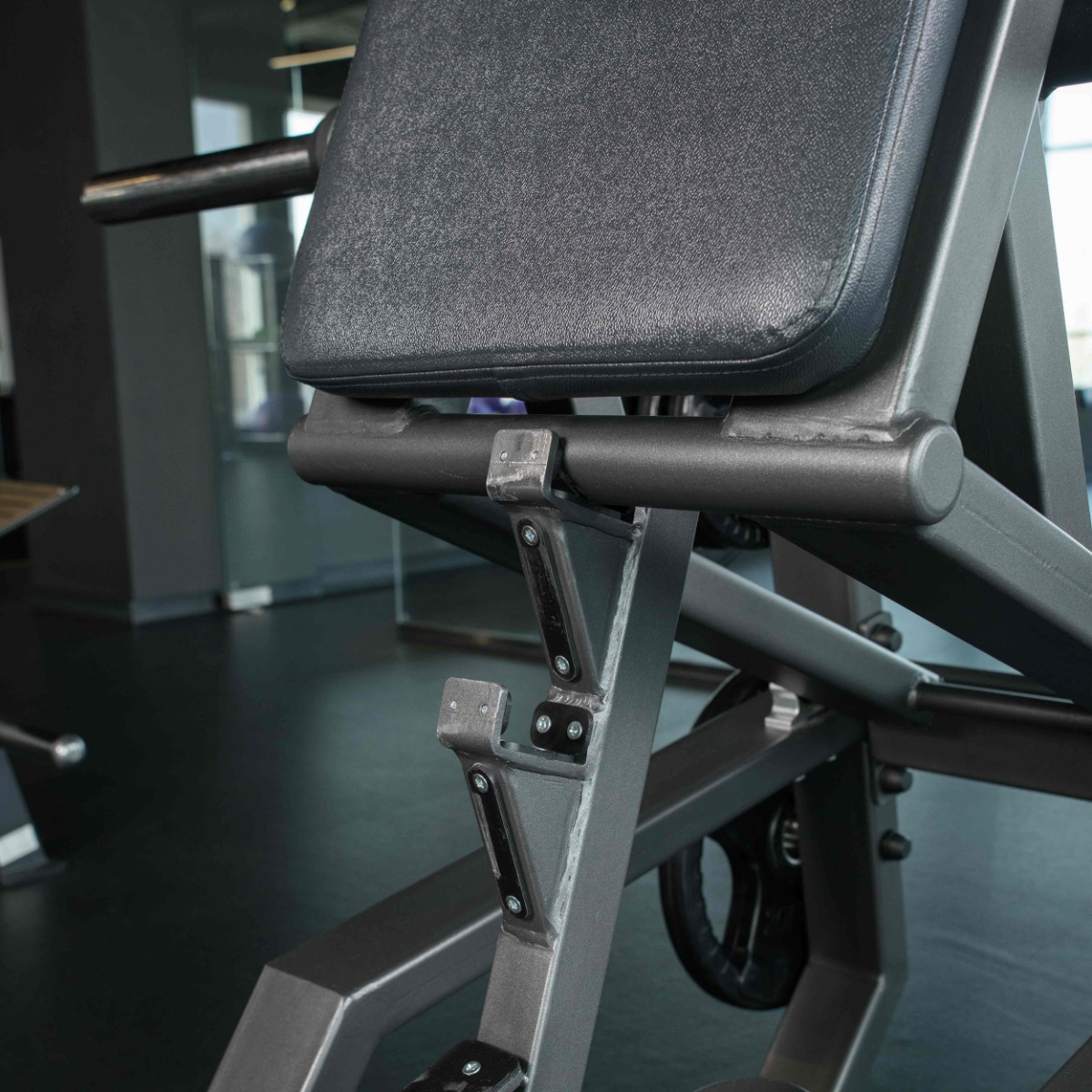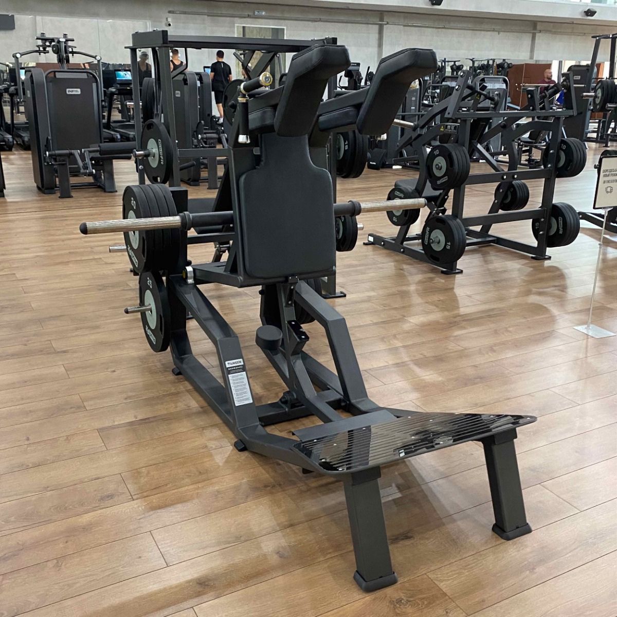 Профессиональный тренажёр для коммерческого использования A3065 Приседание предназначен для акцентированной тренировки мышц нижней части тела — квадрицепсов, ягодичных и приводящих мышц, а также бицепсов бедра. Конструкция позволяет выполнять упражнения в положении лицом или спиной к тренажёру, исключая осевую нагрузку на позвоночник и обеспечивая безопасную работу с большими весами.