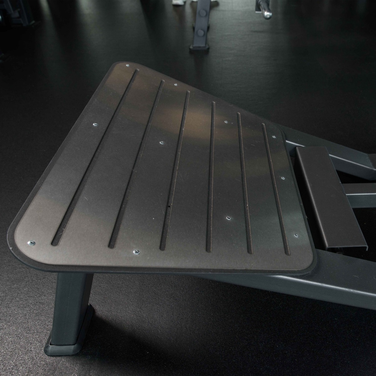 Наклонная нерегулируемая опора для ног увеличенного размера выполнена из металлического профиля и накладки из нержавеющей стали с рифлёной нескользящей поверхностью, обеспечивающей устойчивое положение спортсмена при любых вариантах постановки стоп.