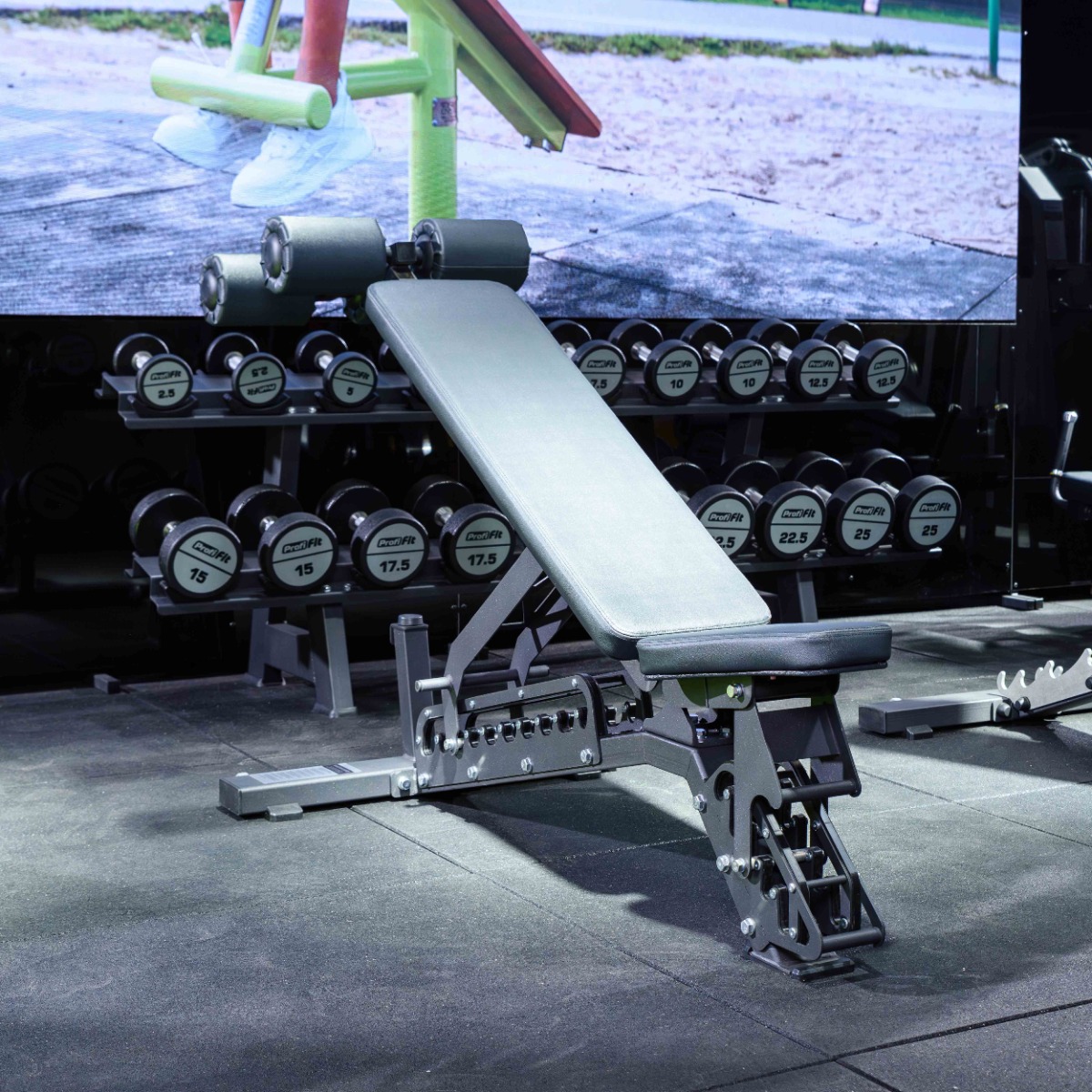 Скамья оснащена встроенной металлической рукоятью и транспортировочными роликами с резиновым покрытием для удобного перемещения по залу.