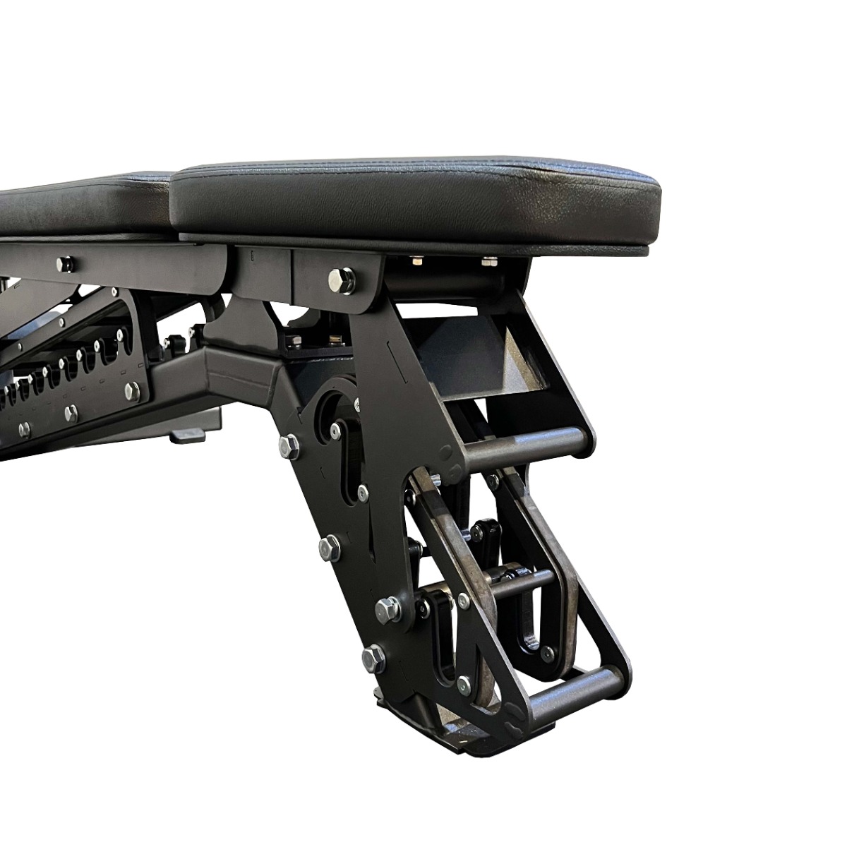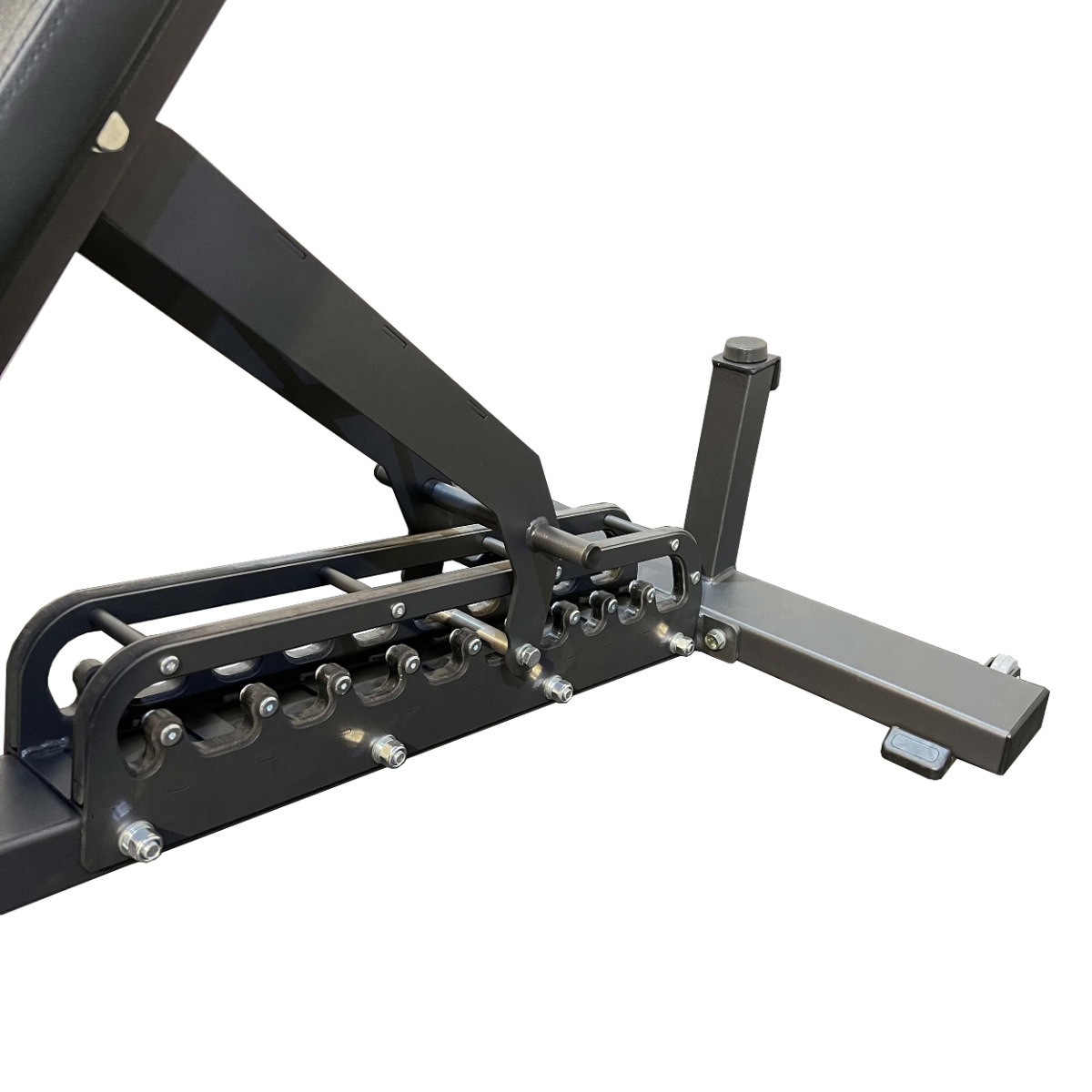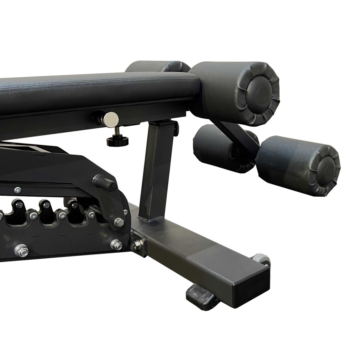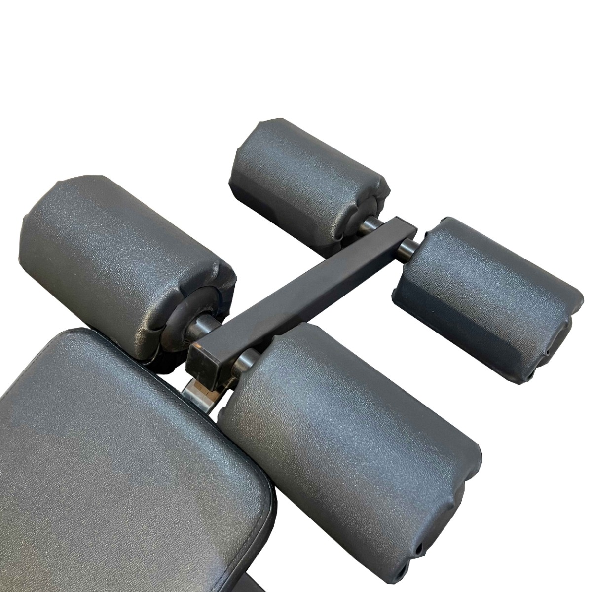 Вылет сдвоенных валиков для фиксации ног регулируется при помощи механического фиксатора с оттяжным механизмом, что позволяет точно настроить рабочее положение под рост и антропометрию пользователя.