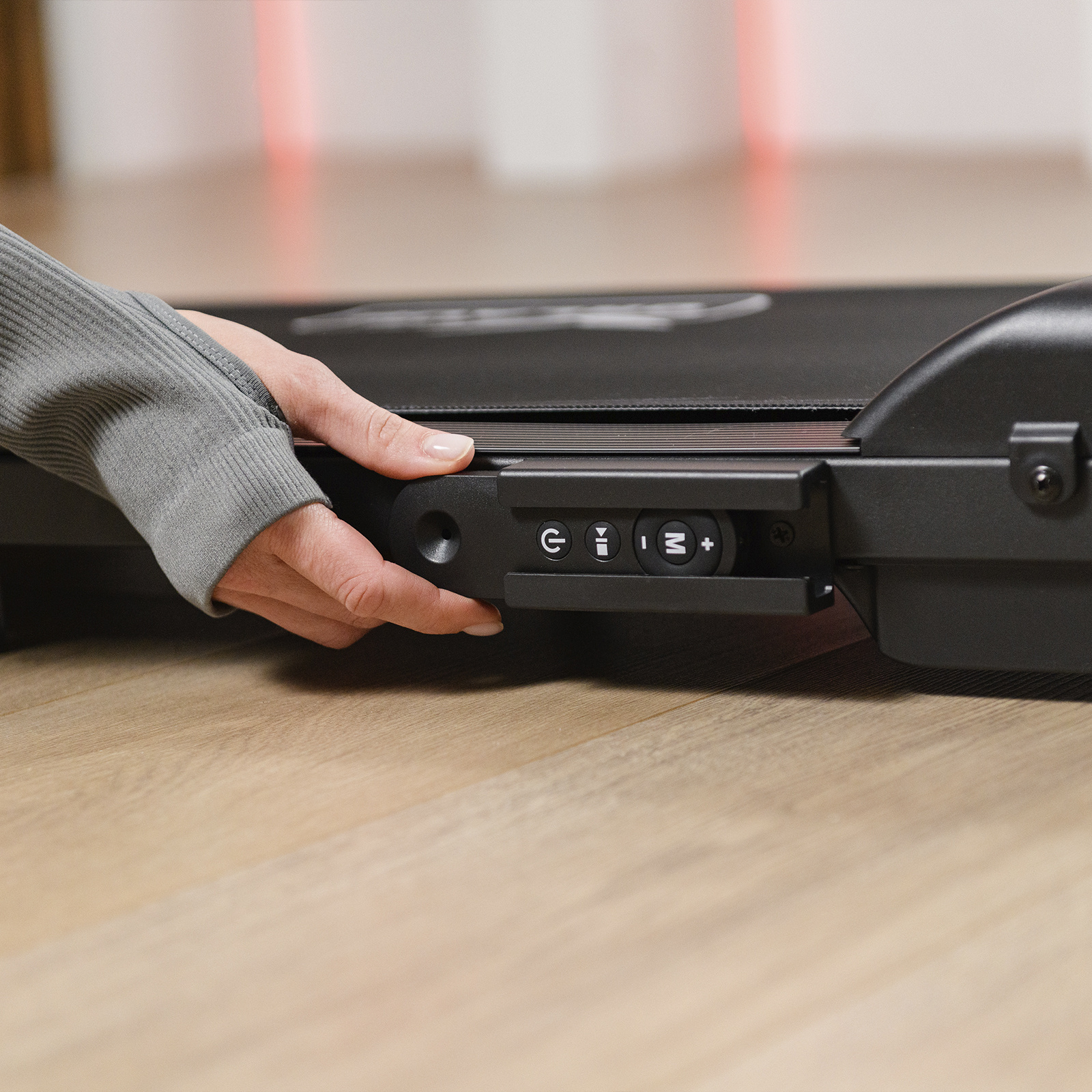 Управление дорожкой осуществляется с помощью пульта дистанционного управления. Дисплей отображает основные параметры тренировки: время, скорость, дистанцию и сожжённые калории. Ключ безопасности обеспечивает мгновенную остановку в случае необходимости.