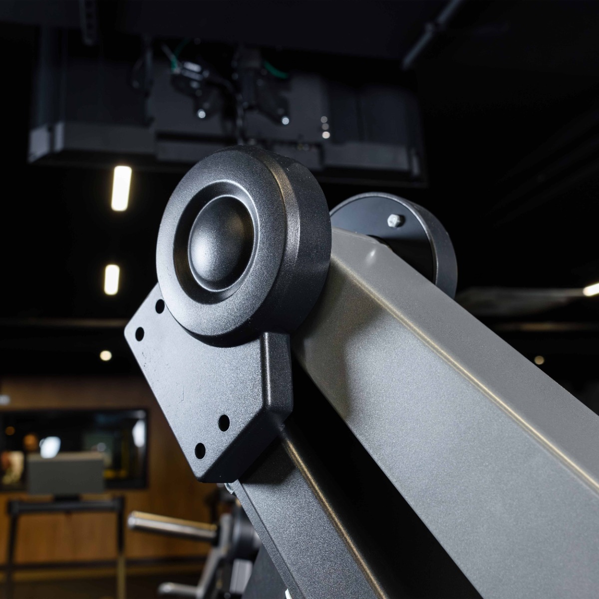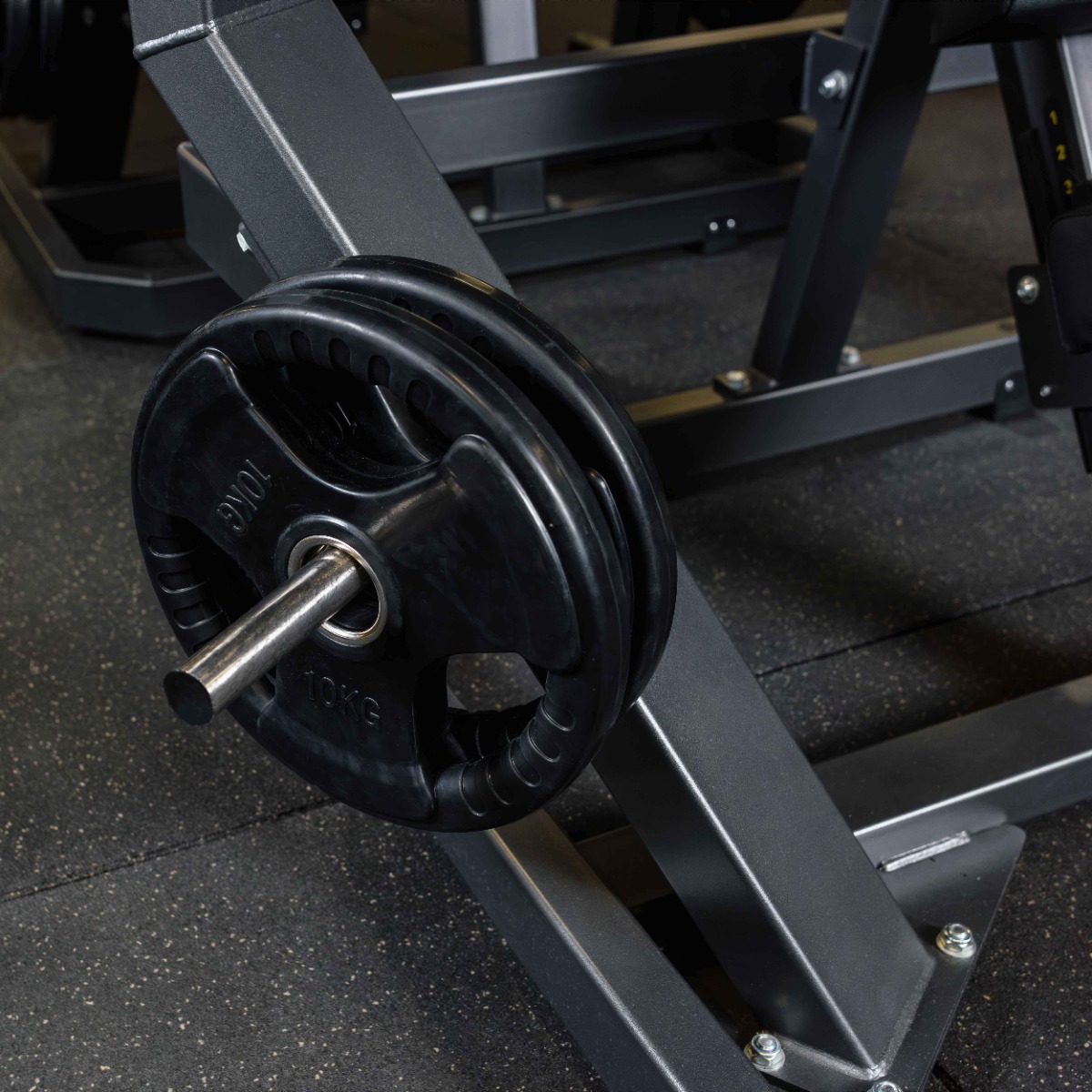 На подвижных рычагах для работы со свободными весами установлено два литых хромированных накопителя из толстостенной стальной трубы длиной 265 мм (рабочая длина 235 мм без учета заглушек и демпферов) для дисков с посадочным диаметром 50 мм. На торцах при помощи болтов закреплены металлические заглушки.