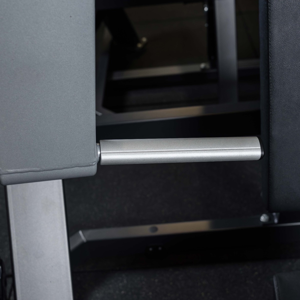 На подвижных рычагах для работы со свободными весами установлено два литых хромированных накопителя из толстостенной стальной трубы длиной 210 мм (рабочая длина 185 мм без учета заглушек и демпферов) для дисков с посадочным диаметром 50 мм. На торцах при помощи болтов закреплены металлические заглушки.