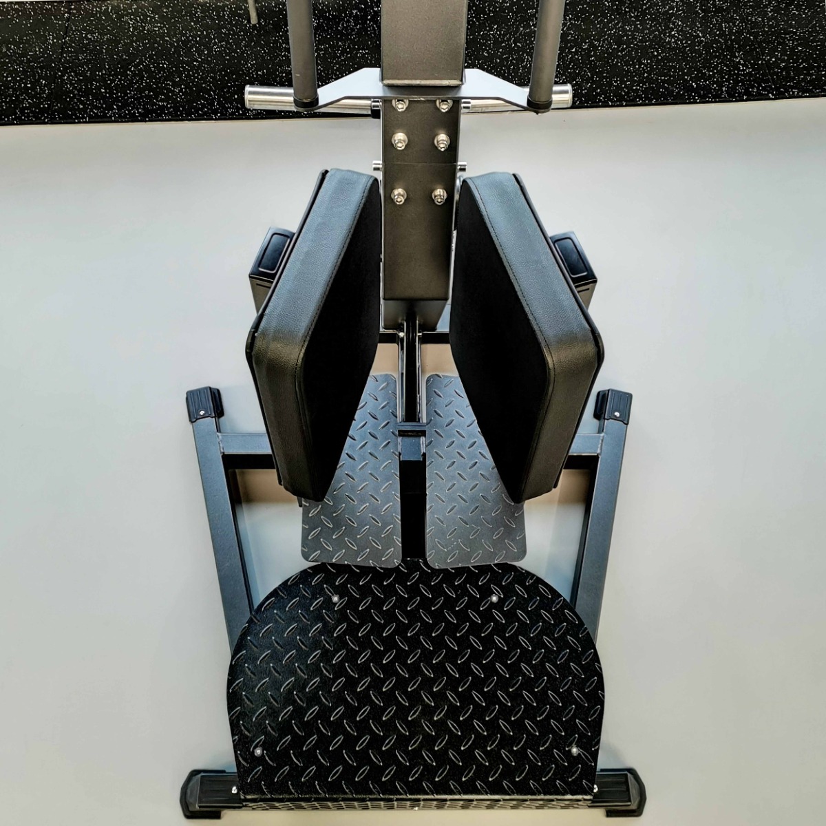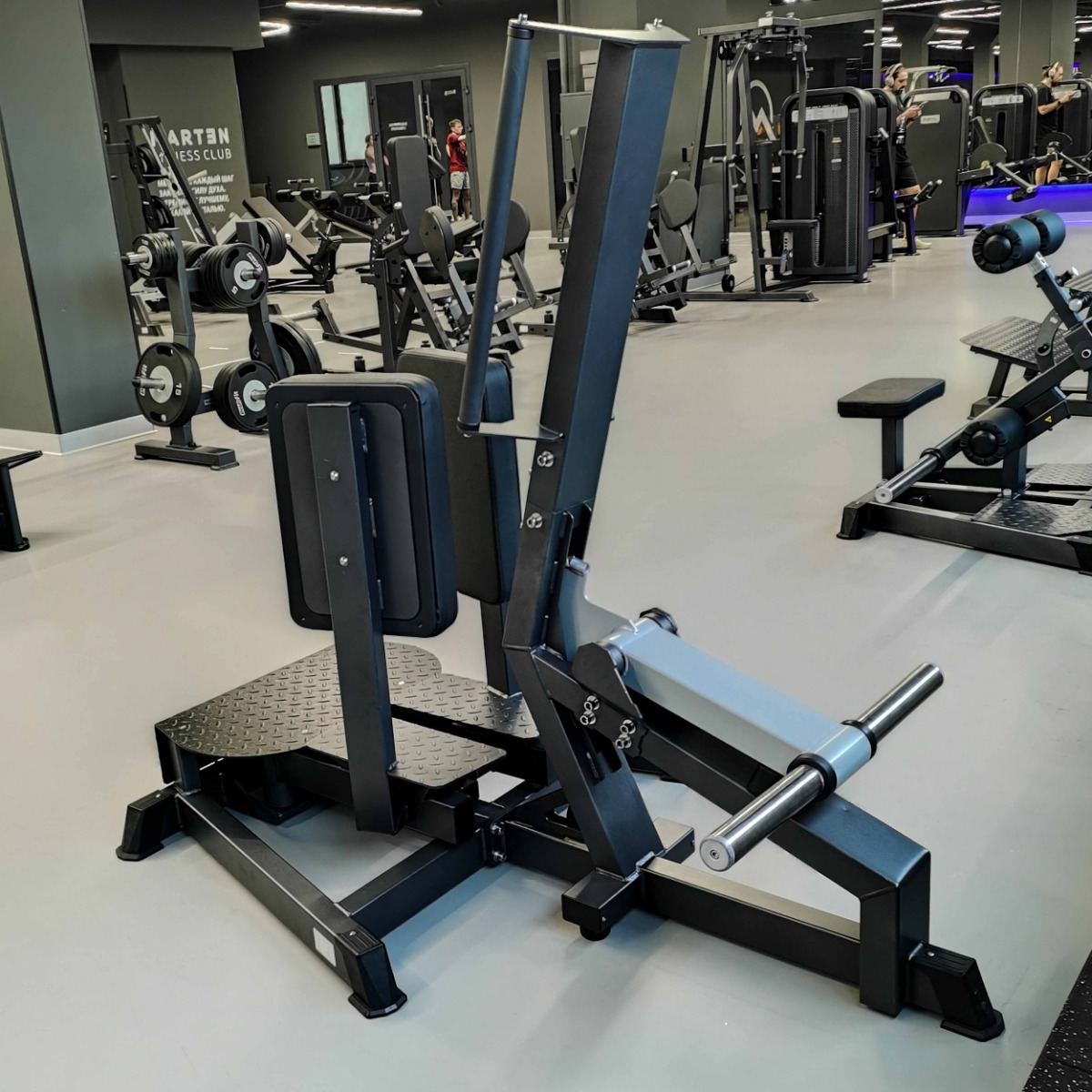 На подвижном рычаге для работы со свободными весами установлено два литых хромированных накопителя из толстостенной стальной трубы для дисков с посадочным диаметром 50 мм. На торцах при помощи болтов закреплены металлические заглушки.