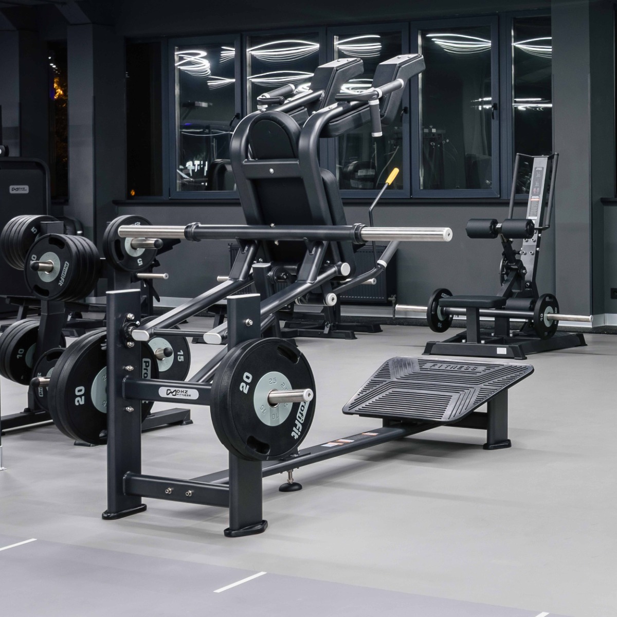 Профессиональный тренажер для коммерческого использования E7065 Приседание предназначен для тренировки больших ягодичных мышц, квадрицепсов и икроножных мышц.