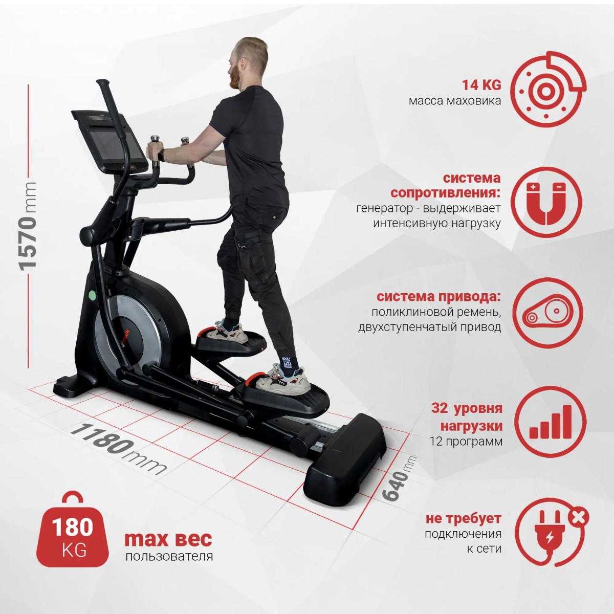 Самогенерирующий механизм не требует подключения к сети. Маховик 14 кг обеспечивает плавный бесшумный ход и надежную работу. Большие педали, покрытые нескользящим материалом, позволяют комфортно тренироваться пользователям весом до 180 кг. Область применения: профессиональная;Количество уровней нагрузки: 32;Максимальный вес пользователя: 180 кг; Консоль: TFT-дисплей, 15.6 дюймов; Размеры товара в сборе: 202 x 75 x 185 см.