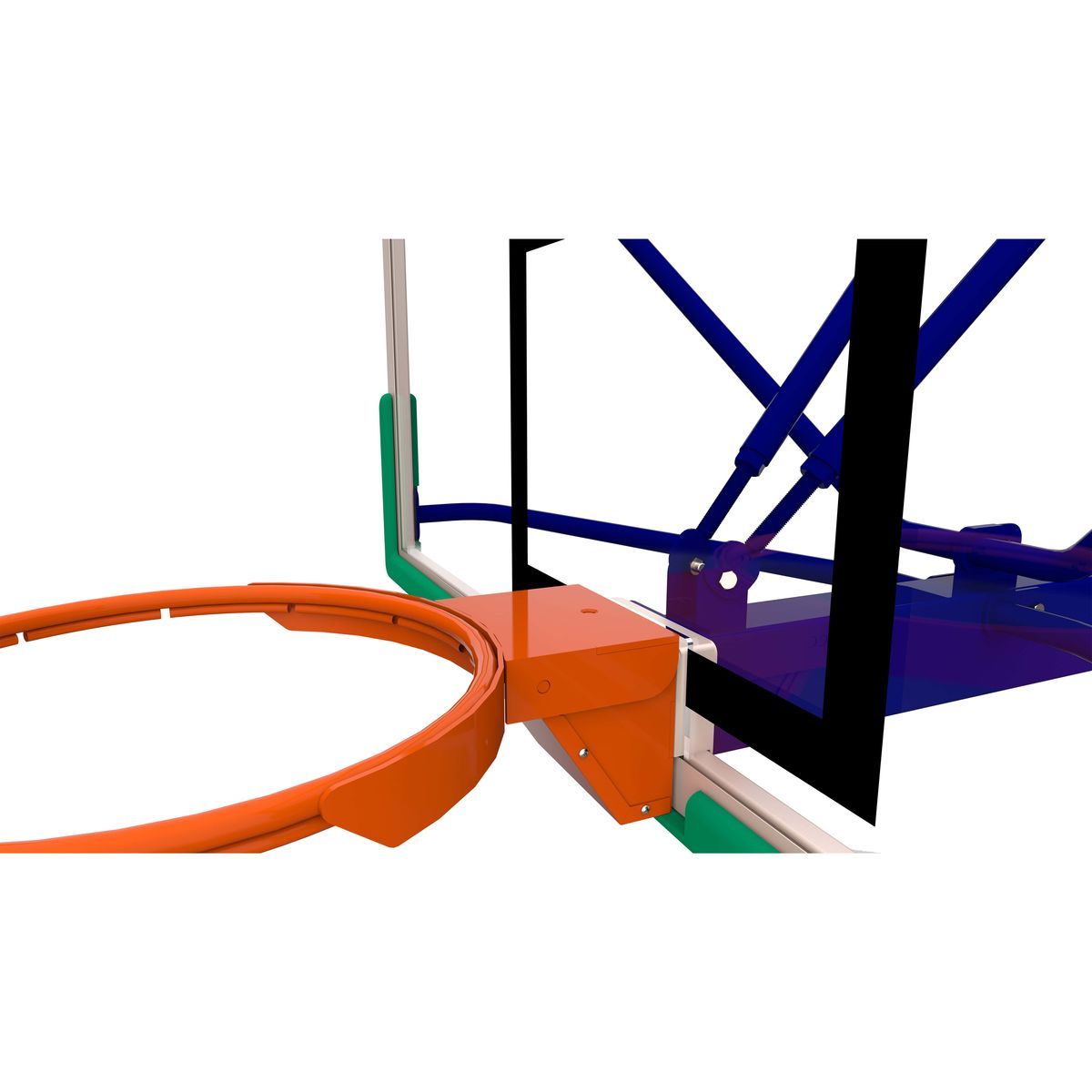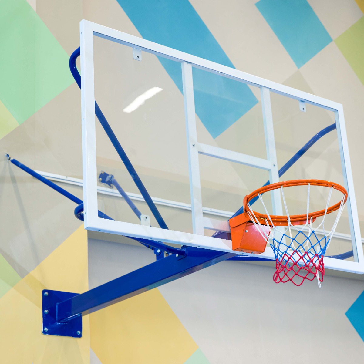 Баскетбольное кольцо крепится непосредственно к несущей балке через щит, тем самым снимая нагрузку с баскетбольного щита.