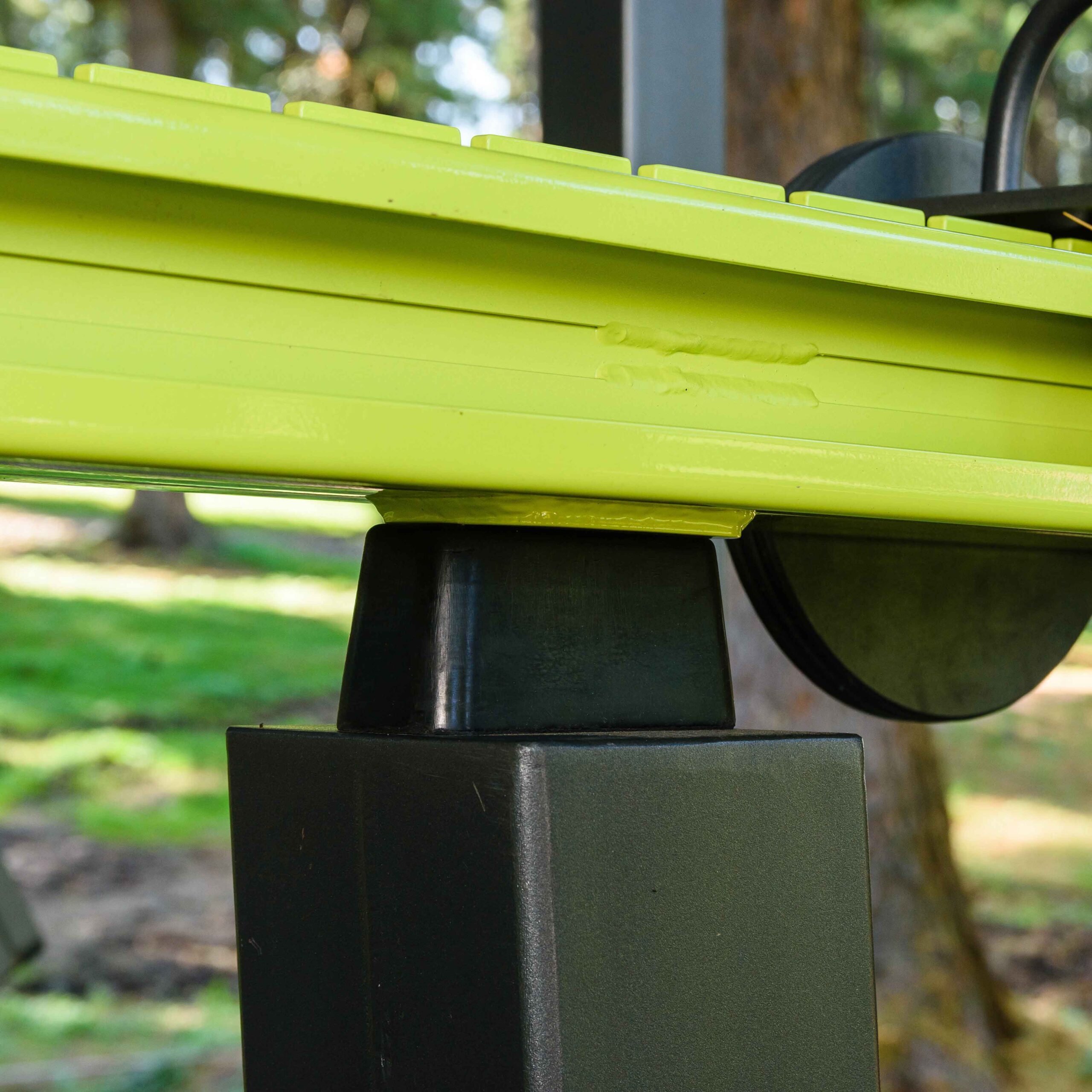 Надёжность и прочность разъёмных соединений конструктивных элементов тренажёра обеспечиваются за счёт использования высококачественного оцинкованного крепежа, выступающие части которого закрыты металлическими защитными колпачками.