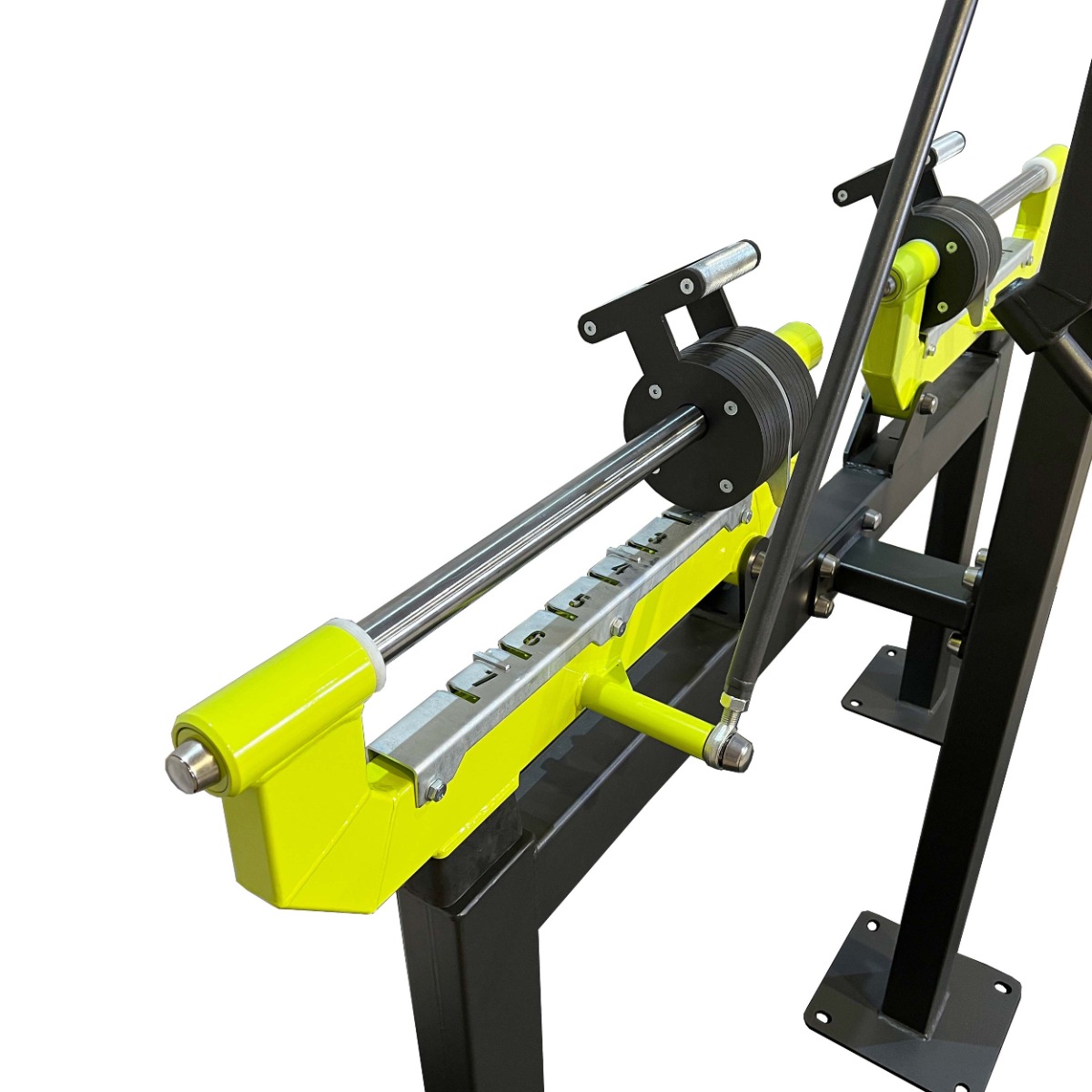 Подвижные рычаги оснащены передвижными грузовыми блоками, изготовленными из листового металла толщиной 8 мм. Перемещение грузовых блоков осуществляется с использованием подшипников при помощи парных рукоятей длиной 120 мм из металлического прутка с мягкой накаткой.