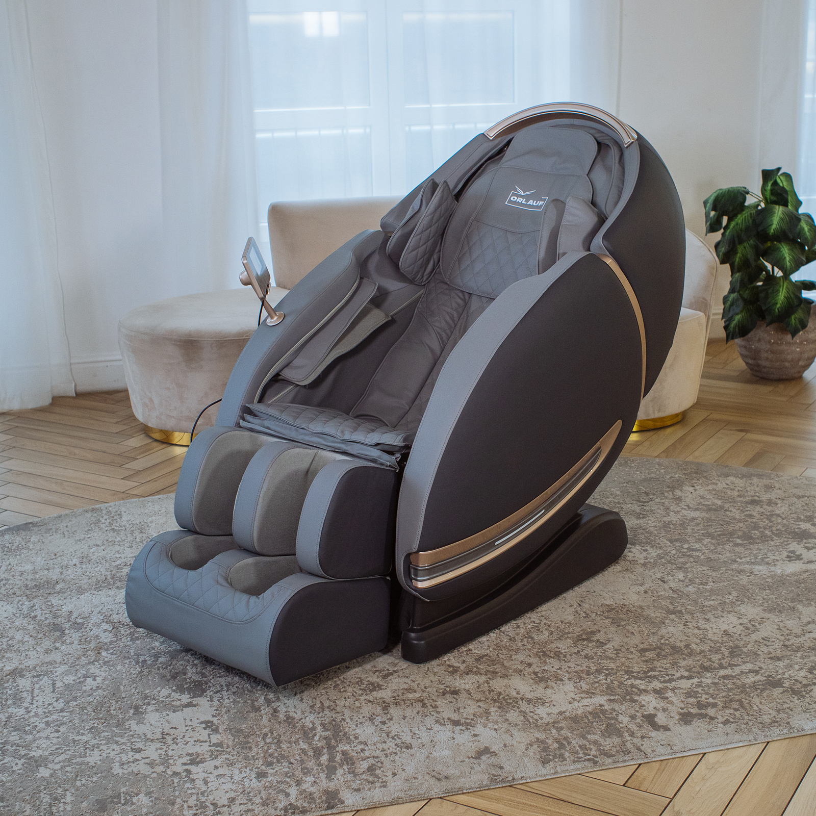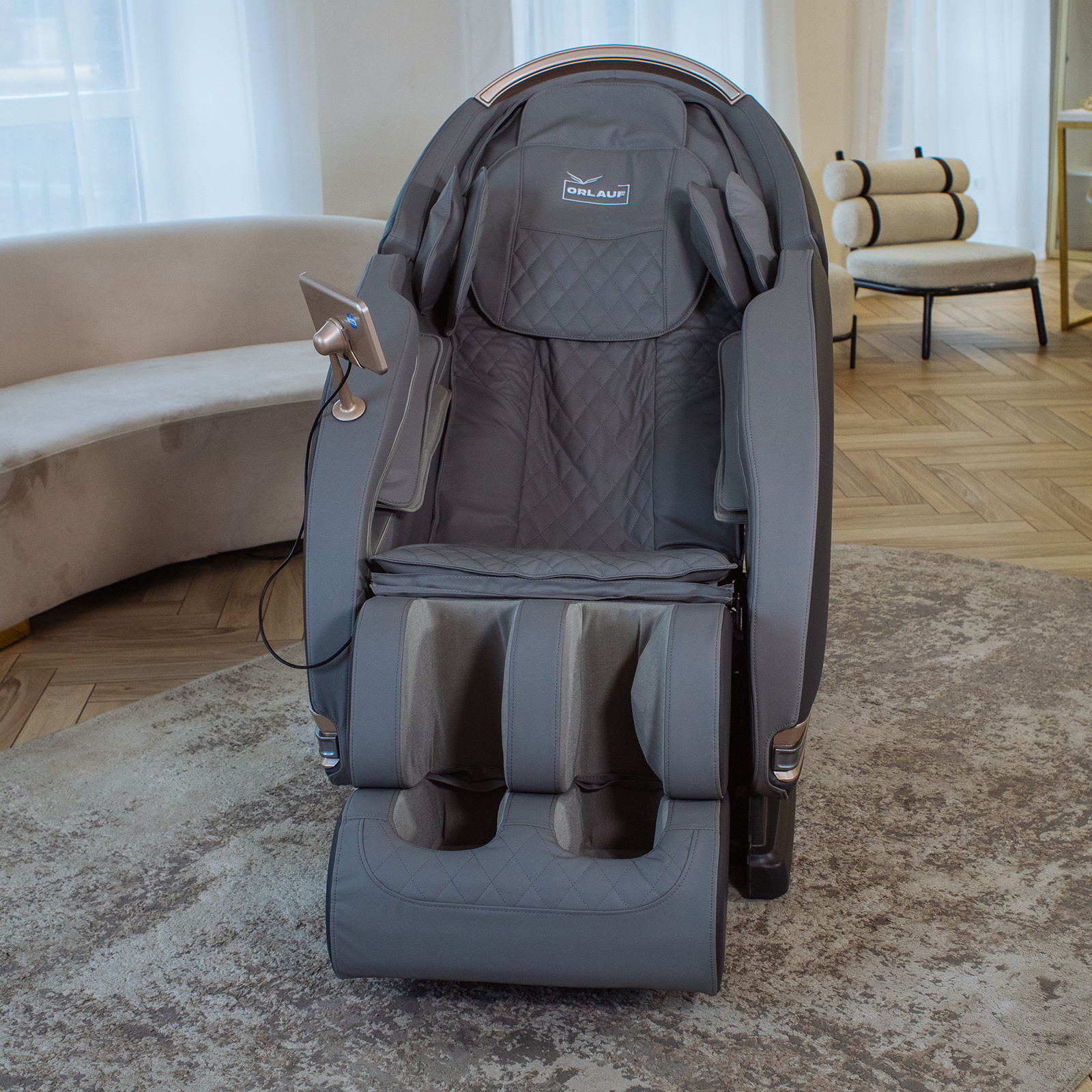 Orlauf Elfen предлагает широкие возможности для персонализации массажа: 5 автоматических программ и 8 ручных режимов. Функция одновременного прогрева поясницы и икр усиливает расслабляющий эффект, а положение Zero-G снимает нагрузку с позвоночника, создавая ощущение невесомости. Продуманная эргономика, включающая выдвижную секцию для ног закрытого типа (выдвигается на 15 см), систему Smart-Slide для экономии пространства (выдвигает кресло на 17 см от стены), интуитивно понятный русифицированный планшет для управления и таймер, обеспечивает максимальный комфорт во время сеанса.