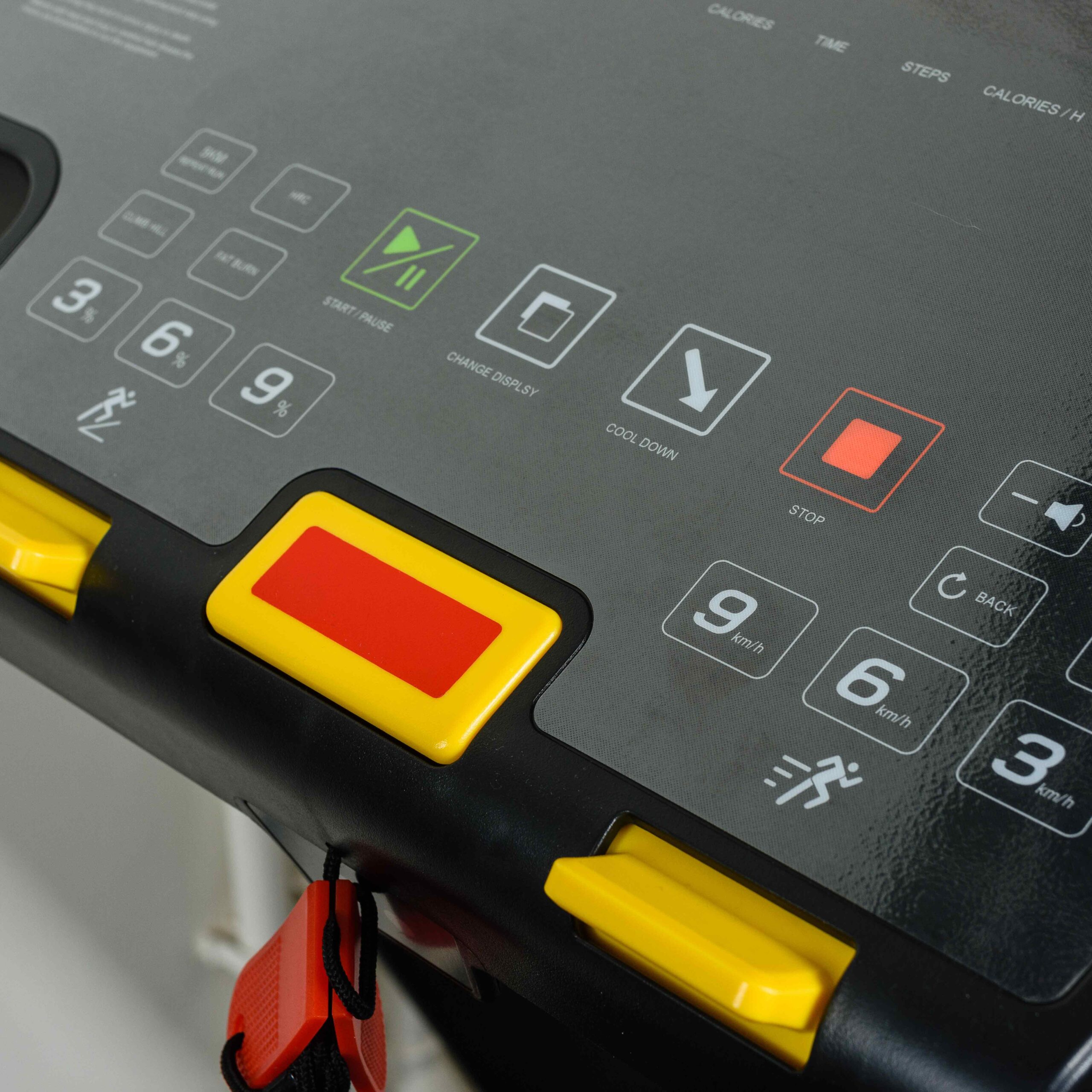Буквенно-цифровая информационная тачскрин панель отображает: частоту сердечных сокращений, пройденное расстояние, угол наклона, израсходованные калории, время тренировки, количество шагов, расход калорий в час, скорость, темп. На панели размещены клавиши старта и остановки, клавиши выбора тренировочных программ, изменение угла наклона (3%, 6%, 9%), изменение скорости (9 км/ч, 6 км/ч, 3 км/ч), программа Cool Down для постепенного снижения темпа при высокоинтенсивной тренировке.