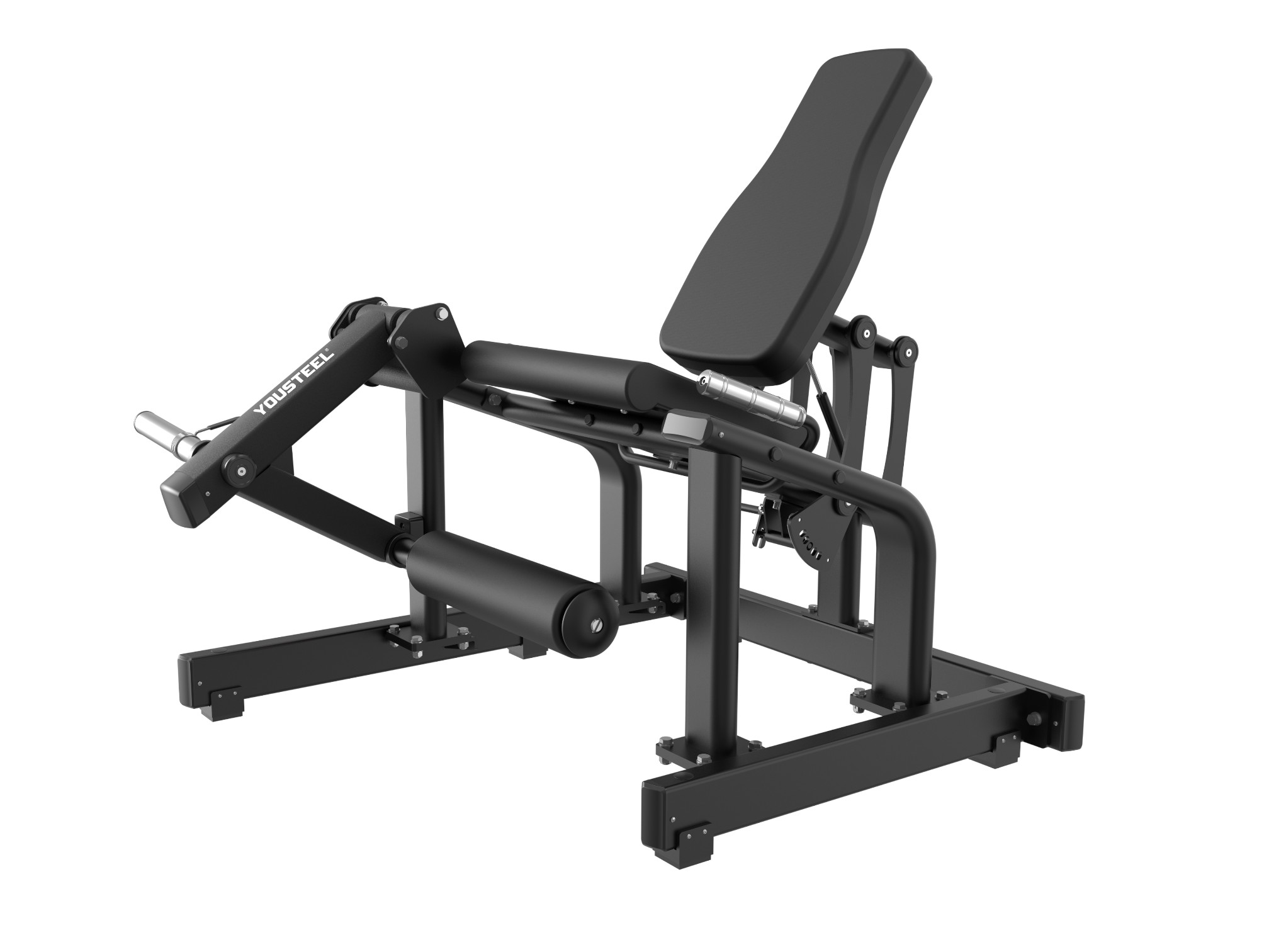 Разгибание ног сидя — это профессиональный тренажер нагружаемый дисками. Предназначен для изолированной проработки четырехглавой мышцы бедра. Регулируемая спинка с механизмом одновременного изменения угла наклона и горизонтального положения — на четырёх алюминиевых направляющих для пользователей разного роста и комплекции — 5 позиций. Для изменения позиции спинки тренажера достаточно оттянуть пружинный фиксатор и поменять позицию. Фиксатор снабжен стальными сердечниками и прочной рукояткой. Надежность и долговечность узла вращения рычага обеспечена с помощью корпусных подшипников на алюминиевых подушках и стальных осей, конструкция закреплена винтами и широкими торцевыми шайбами. Полноразмерная спинка и сиденье с контурной эргономичной формой, а также широкий валик для ног придают дополнительный комфорт, уменьшают давление на тело атлета при работе с большими весами и позволяют занять удобное положение на тренажере. Все мягкие части имеют наполнитель пенополиуретана и покрыты прочной и гипоаллергенной премиальной искусственной кожей для профессионального применения, толщина 60мм. Рукояти для боковой поддержки изготовлены из алюминия имеют насечку для надежного хвата. Хромированная втулка для дисков выдерживает нагрузку до 150 кг, имеет посадочный диаметр 50мм и снабжена резиновым защитным кольцам для предотвращения повреждения конструкции тренажера. Каркас выполнен из толстостенного стального профиля 3мм и сварен на современном лазерном оборудовании.