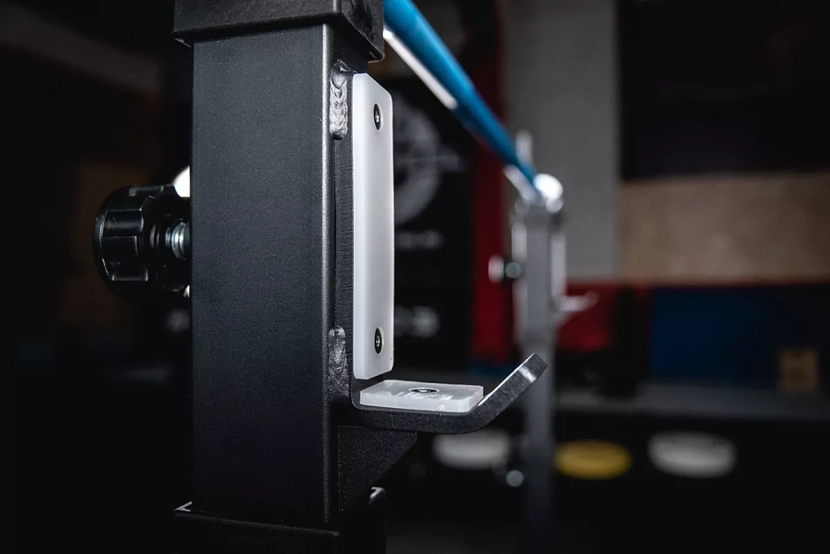 В этой версии стоек мы доработали конструкцию опоры, фиксирующие болты и изменили конструкцию нижней пары крюков, которые теперь по форме повторяют верхние. Благодаря этому выполнять жим лёжа стало гораздо удобней. Стойки стали жестче и устойчивее за счет того, что мы убрали механизм регулировки ширины. Теперь внутренняя ширина фиксированная – 1100мм. Механизм фиксации – болт с пружинным фиксатором. Во время тренировок с большими весами его можно закрутить, тем самым увеличив жёсткость фиксации. Но для ежедневных тренировок рядовых клиентов это не обязательно. На стойках 4 таких болта: 2 на регулировку высоты стоек и 2 на страховочные упоры. Верхние и нижние крюки покрыты пластиком, для предотвращения повреждения насечки грифа.