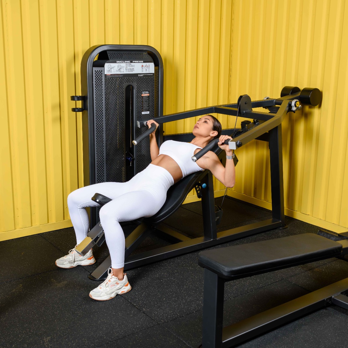 Тренажер предназначен для тренировки следующей группы мышц: большая грудная, малая грудная, передние дельты, трицепс. Упражнение схоже с упражнением жим штанги лёжа под углом