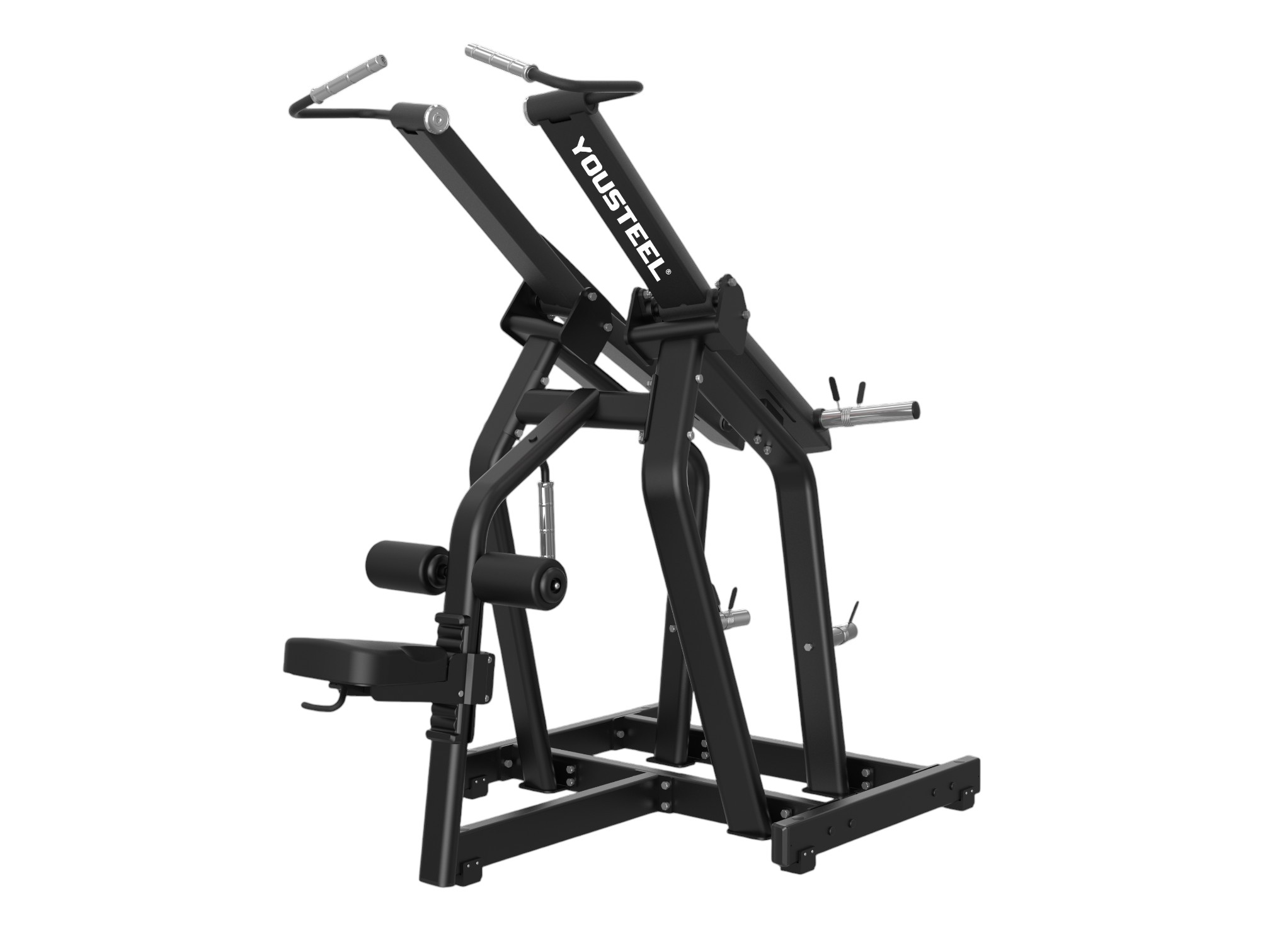 Верхняя тяга — это профессиональный тренажер нагружаемый дисками. Отлично подойдет для развития широчайших мышц спины. Независимое движение рычагов моделирует естественную траекторию движения и позволяет работать как двумя, так и одной рукой. На центральной части рамы расположена рукоять для возможности тяги одной рукой. Рукояти из алюминия имеют насечку для надежного хвата. Резиновые амортизаторы на рычагах предотвращают повреждение покрытия при резком опускании рычагов и смягчают конечную точку выполнения упражнения. Удобное сиденье, толщиной 60мм, из пенополиуретана обтянуто искусственной кожей и имеет трещоточный механизм для быстрой регулировки по высоте, под валики упора бёдер. Каркас выполнен из толстостенного стального профиля 3мм и сварен на современном лазерном оборудовании. Два хромированных кронштейна для хранения дисков под посадочный диаметр 50мм. Втулки кронштейнов для дисков расположены под небольшим углом, для предотвращения скатывания дисков во время работы и хранения. Максимальная весовая нагрузка до 300кг.