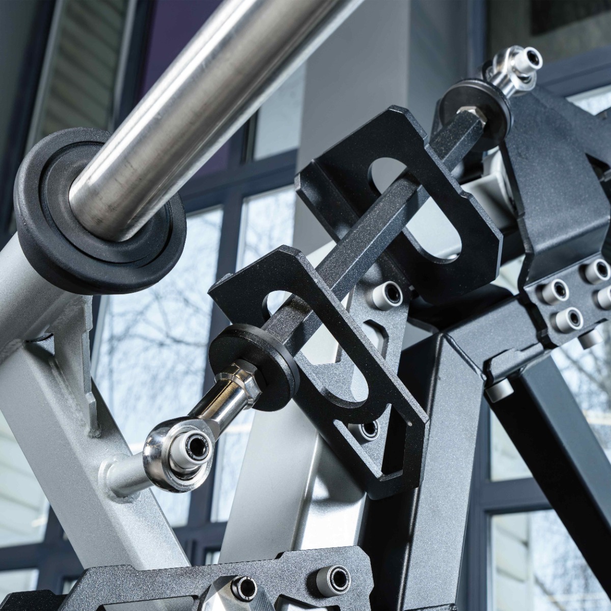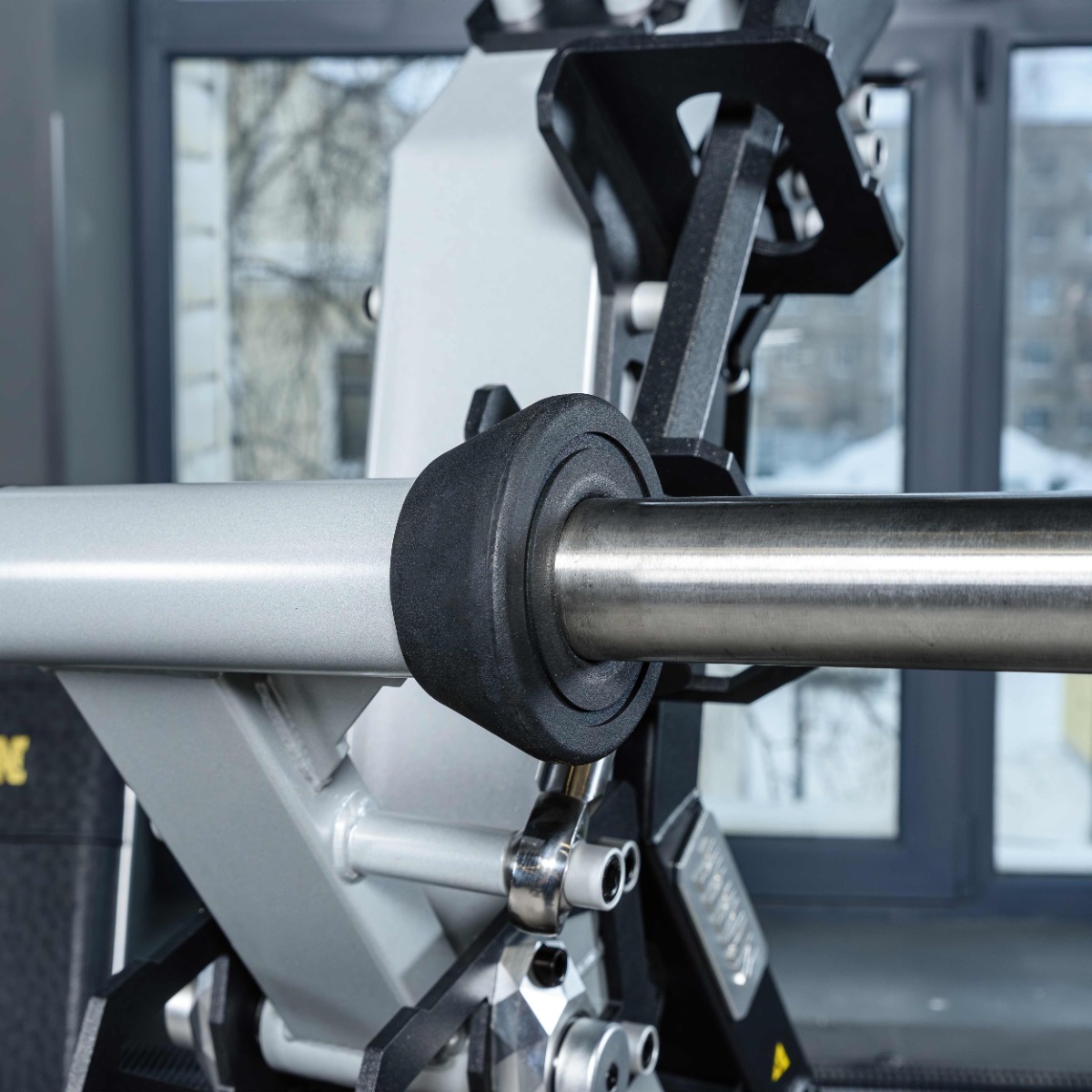 Накопители на подвижных рычагах и статичные для хранения оборудованы кольцами из плотной резины для предотвращения соприкосновения дисков с рамой тренажера и амортизации при размещении свободных весов на накопителях.