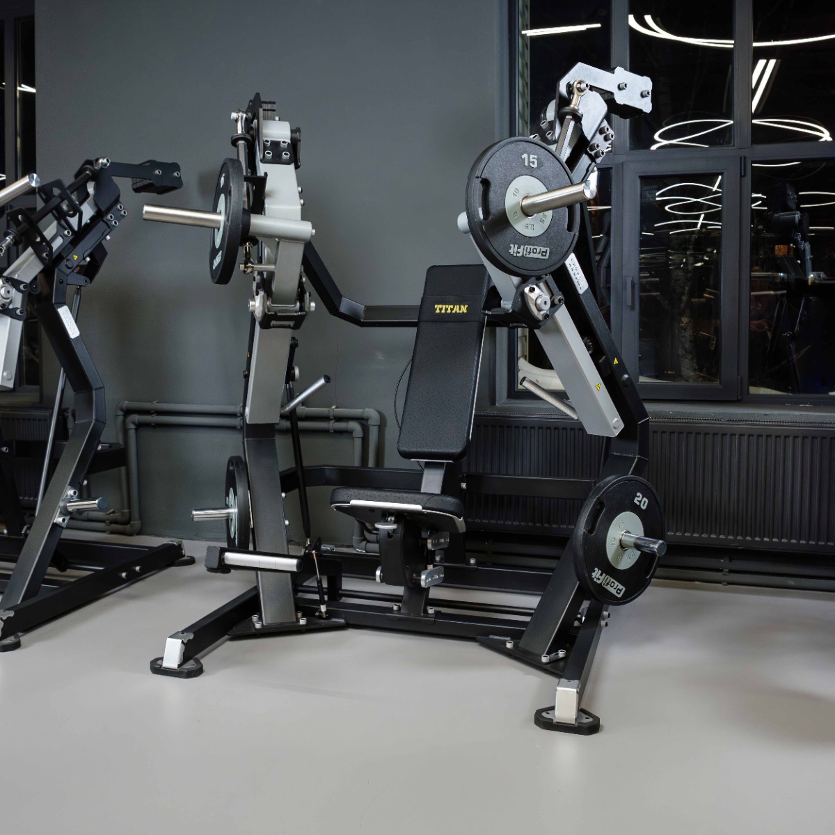 На подвижных рычагах для работы со свободными весами установлено два литых хромированных накопителя из толстостенной стальной трубы длиной 300 мм для дисков с посадочным диаметром 50 мм.